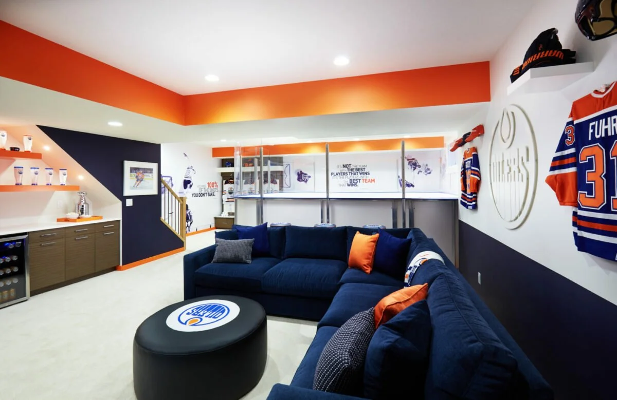 New home buyers could add a custom Coventry Lifestyle package to the build. Packages included home theatres, home gyms and kitchen upgrades. With the new Oilers® partnership, the company added a Fan Cave option to the list of packages. I created the design and worked with the 3D renderers, the in-house Interior Designer and Site Supervisors to complete the Oilers® Fan Caves in two showhomes.